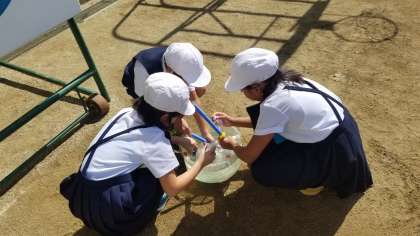 4年2組の理科の様子です。「空気と水」の単元で、水鉄砲を使って学習しています。