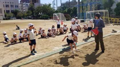 2年生の様子です。立ち幅跳びとソフトボール投げの様子です。立ち幅跳びでは、先生から「大きく腕を振って高く跳びましょう」と助言されていました。係の児童もしっかりとお手伝いができていました。