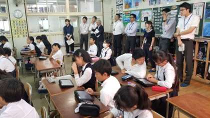 日常的な学習のツールとして活用している普段の授業を参観してもらいました。子どもたちがタブレットを当たり前に使う様子に驚いておられました。