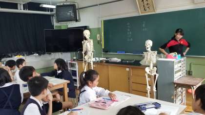4年2組の理科と5年1組の体育の様子です。理科は「人の体のつくりと運動」で人体模型を活用して学習しています。