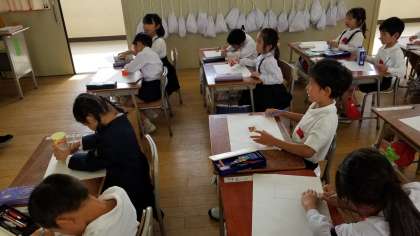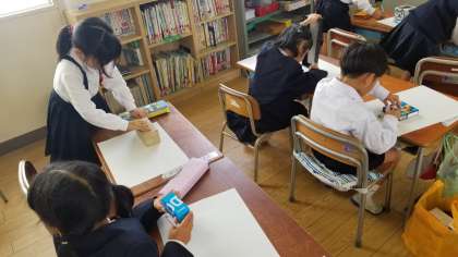 1年1組の算数の様子です。今日のめあては、「かたちをうつして えをかこう」です。いろいろな形の箱などを画用紙にうつした後、絵を描きます。