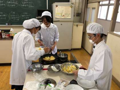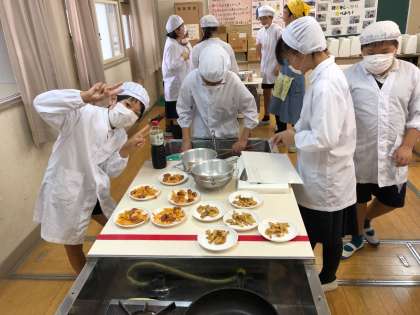 6年1組の家庭科の様子です。じゃがいもを使った創作料理です。