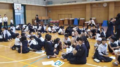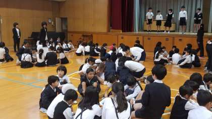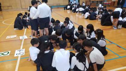 本日体育館で児童集会を行いました。今日の集会は、縦割り班毎に考えたキャラクターのビンゴゲームです。当たった班からは「やったー」といった声があがっていました。