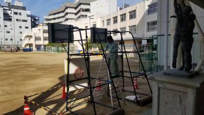 管理作業員さんがバスケットゴールのペンキ塗りをしてくれています。