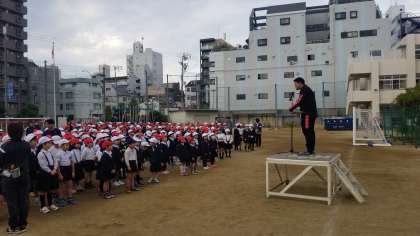 本日、運動場で児童朝会を行いました。学校長より転入生の紹介がありました。宮田先生より週目標についてお話がありました。今週の目標は「チャイムの合図を守ろう。」です。