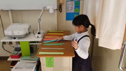 1年1組の図工の様子です。準備された紙を、まるめる・おる・きるなどの工夫をして、「ふしぎな おめん」を作成しています。