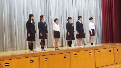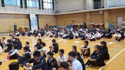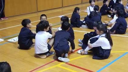 本日、体育館で児童集会を行いました。今日の集会はクイズです。各班で出された問題の答えを考えています。