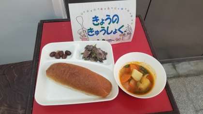 今日の給食は、牛肉の香味焼き、ケチャップ煮、うずら豆のグラッセ、パン、牛乳です。しっかり食べましょう。