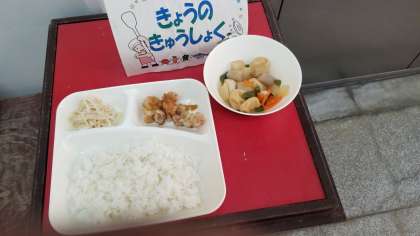 今日の給食は、あげどりのねぎだれかけ、含め煮、もやしのゆずの香あえ、ごはん、牛乳です。しっかり食べましょう。