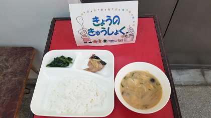 今日の給食は、なまりぶしのしょうが煮、みそ汁、ほうれんそうのおひたし、ごはん、牛乳です。しっかり食べましょう。