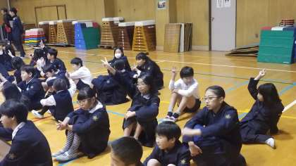 本日、体育館で児童集会を行いました。今日の集会は「イントロクイズ」です。知っている曲がかかると、笑顔で答えていました。