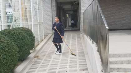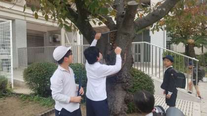 美化委員の児童が清掃活動をしてくれています。「木についたきのこ」を取ってるようです。