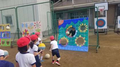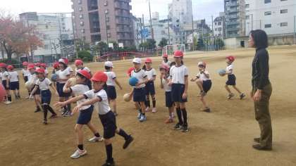 2年1組の体育の様子です。ボール遊び運動です。投げる運動を行っています。