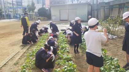 5年2組の様子です。天王寺蕪のまわりの雑草を抜いています。大きく育ってほしいですね。