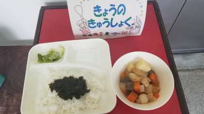 今日の給食は、関東煮、のりのつくだ煮、あっさりキャベツ、ごはん、牛乳です。しっかり食べましょう。