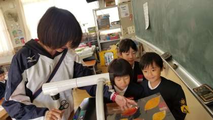 写真上:きれいな落ち葉をラミネートしてもらっています。