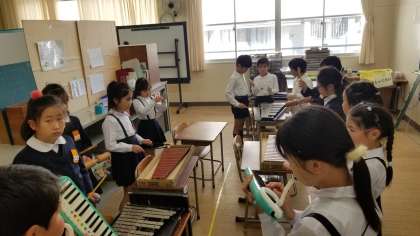 写真下:音楽発表の練習をしています。仲良く楽しそうです。