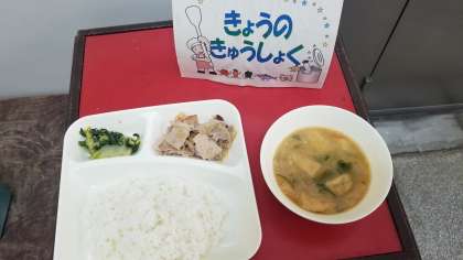 今日の給食は、豚肉のしょうが焼き、さつまいものみそ汁、きくなとはくさいのごまあえ、ごはん、牛乳です。しっかり食べましょう。