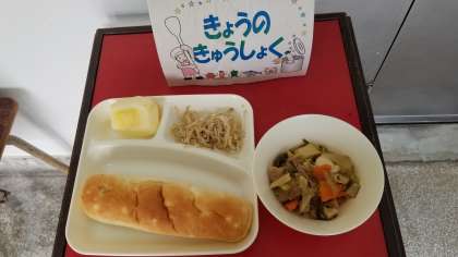 今日の給食は、八宝菜、もやしのごま酢あえ、りんご、パン、牛乳です。しっかり食べましょう。