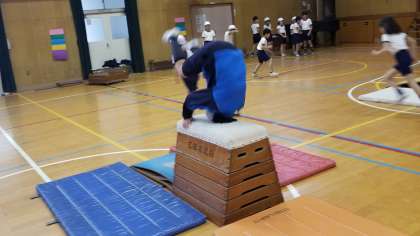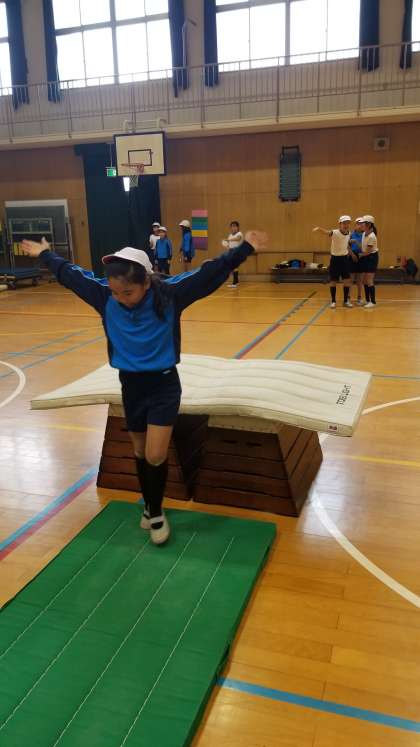 4年2組の体育の様子です。台上前転の練習をしていました。きれいに前転して着地を決めていました。
