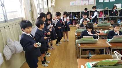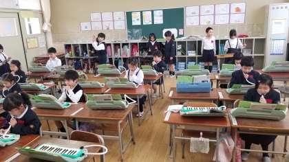 1年2組の音楽の様子です。高い音や低い音が重なって、きれいな音になることを実感できました。