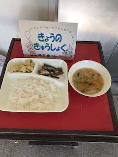 今日の献立は、イワシの生姜煮、うすくず汁、こうやどうふの卵とじです。イワシの生姜煮は骨まで食べられるように煮込んであります。おいしくいただきましょう。