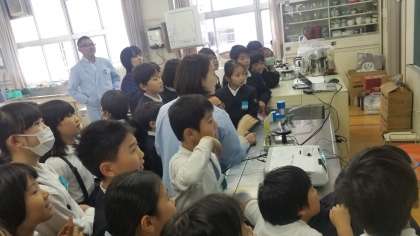 カルピスを水で溶かした水溶液を顕微鏡で見ると、見事に乳酸菌が確認できました。新しいことを発見した時の、子どもたちの笑顔が素敵です。アサヒ飲料の皆さん、ありがとうございました。