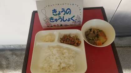 今日の給食は、鶏肉と野菜の煮もの、じゃこ豆、かぶのゆず風味、ごはん、牛乳です。しっかり食べましょう。
