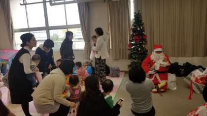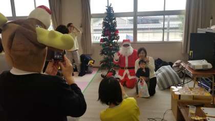 今日は、サンタクロースさんもきてくださいました。子どもたちも大喜びです。順番にサンタさんと一緒に記念撮影です、