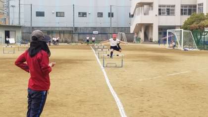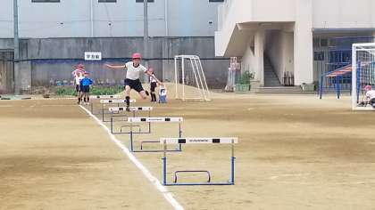6年1組の体育の様子です。ハードル走の様子です。インターバルをリズミカルに走ることができていました。