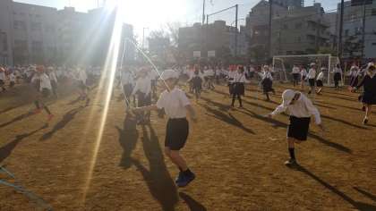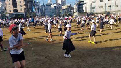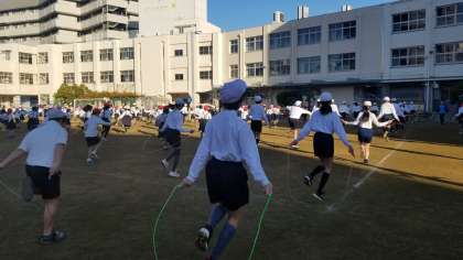本日、運動場で体育朝会を行いました。今日の体育朝会は縄跳び運動です。みんな元気に縄跳び運動を頑張っていました。