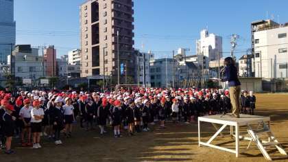 本日、運動場で児童朝会を行いました。最初に、校長先生よりバレークラブ、サッカークラブと感想作文の表彰を行いました。次に篠崎先生より、週目標についてお話がありました。今週の目標は「身のまわりを整理整頓しよう。」です。