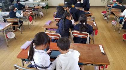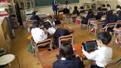 1年1組の算数の様子です。タブレットを使って授業をします。互いに操作を教えあいっこしています。