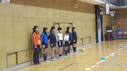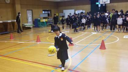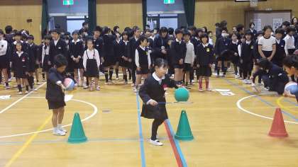本日、体育館で児童集会を行いました。今日の集会は、バドミントンのラケットにボールをのせて運ぶゲームです。案外難しく、各班苦戦していました。
