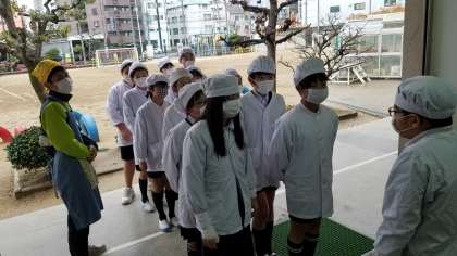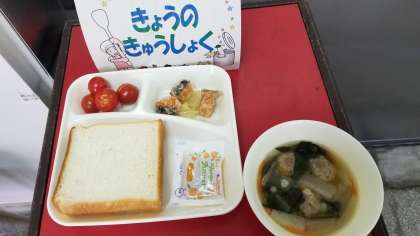 今日の給食は、さけのマリネ、肉だんごと麦のスープ、プチトマト、パン、牛乳です。しっかり食べましょう。