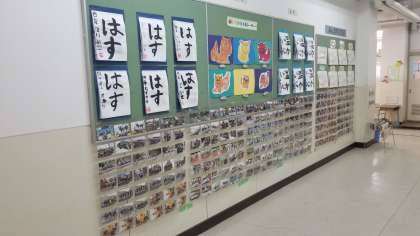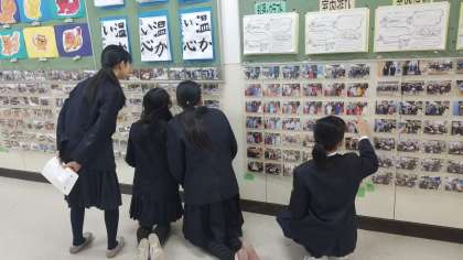 6年生が、給食の配膳前に修学旅行の写真を見ています。