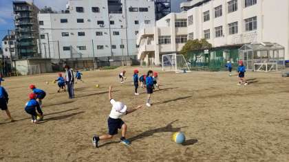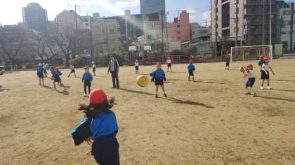 1年1組の体育の様子です。ボール運動をしています。投げることも受けることも案外難しい運動です。楽しく活動できていました。