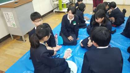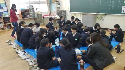 6年1組の句会の様子です。「春の海」の琴の音を聴きながら、グループで句の鑑賞会です。互いに感想を発表していました。
