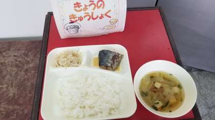 今日の給食は、サバの味噌煮、すまし汁、もやしのゆずのかあえでした。