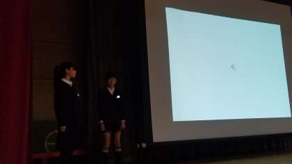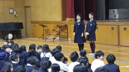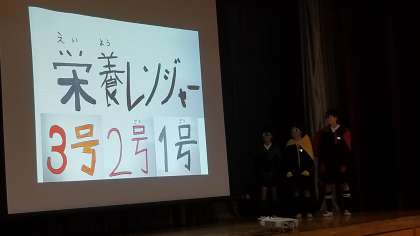 本日、体育館で児童集会を行いました。今日の集会は、1月24日の給食記念日に合わせて、給食委員会による給食の発表です。