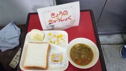 今日の給食は、豚肉と野菜のカレー煮、カリフラワーとコーンのサラダ、りんご、パンです。しっかり食べましょう。
