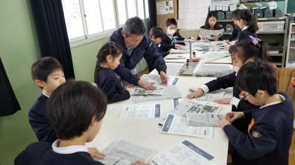 新聞紙で、紙スリッパを作成して、歩行体験を行いました。