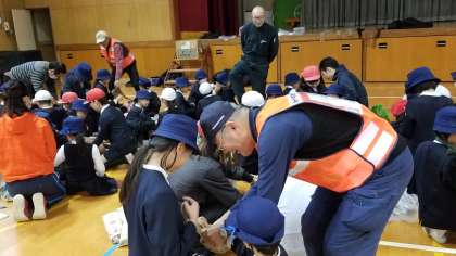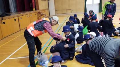 日本赤十字社の皆さんの協力で、身近なものを使って応急処置ができることを学習しました。