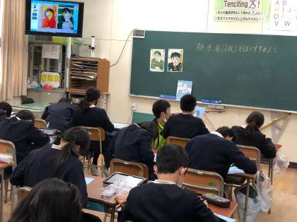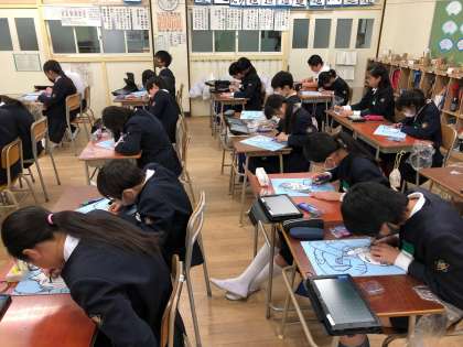 6年2組の図工の様子です。版画の学習をしています。タブレットで撮影した友だちの顔を題材にしています。