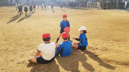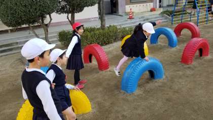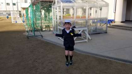 朝の様子です。「片手で跳べるよ。」元気にタイヤの片手跳びを見せてくれました。みんな元気に遊んでいます。