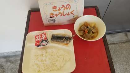 今日の給食は、いわしのしょうがじょうゆかけ、含め煮、いり大豆、ごはん、牛乳です。今日の献立は、節分の行事献立です。しっかり食べて、病気や悪い出来事を追い払いましょう。