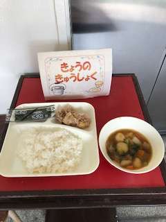 今日の給食は、鶏肉のから揚げ、まる天のうま煮、焼きのり、でした。ごちそうさまでした