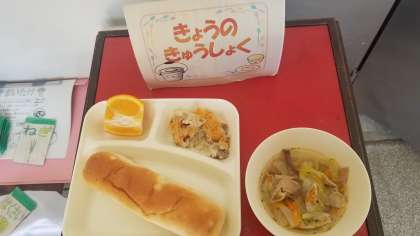 今日の給食は、押麦のグラタン、スープ、いよかん、パン、牛乳です。しっかり食べましょう。