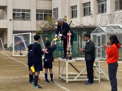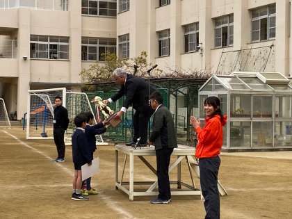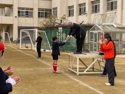 本日、運動場で児童朝会を行いました。最初に、かけ足大会、全日本ソフトボール大会天王寺区優勝、LSウインターカップ決勝トーナメント優勝の表彰を行いました。