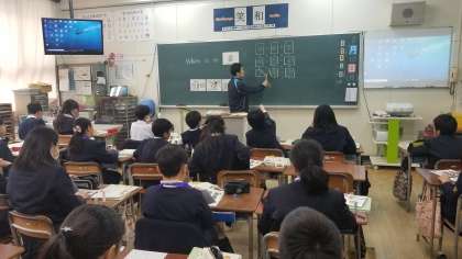 5年1組の英語の様子です。先生から指示された場所を、隣の児童に英語で伝えています。